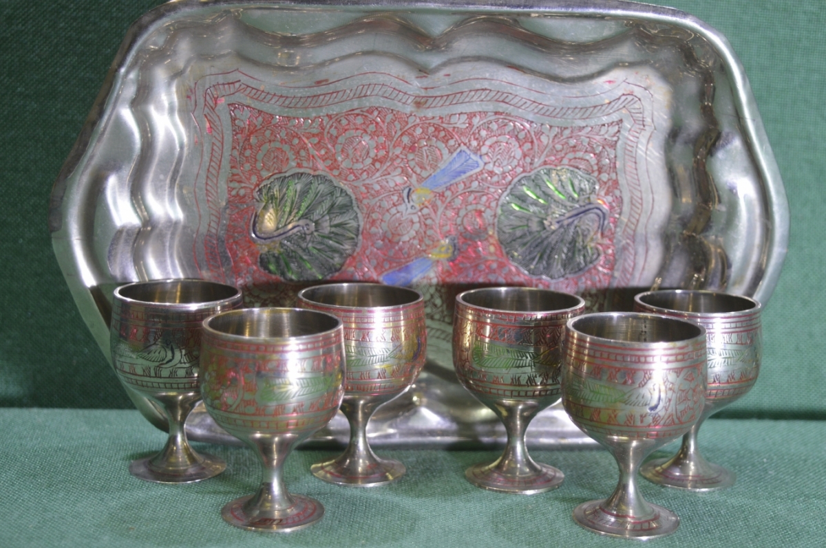 Набор рюмок с подносом "Павлин". Металл, резьба. Винтаж. Индия.