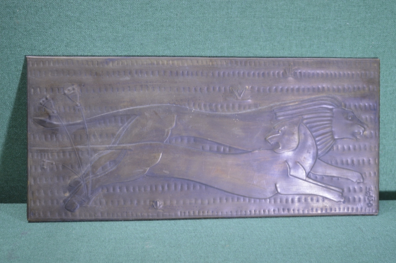 Панно настенное чеканка "Лев и львица". Медь. СССР.
