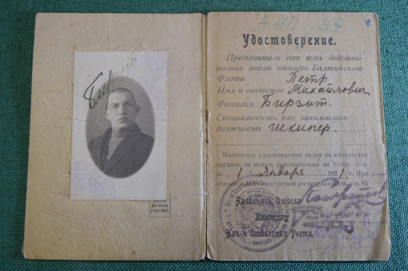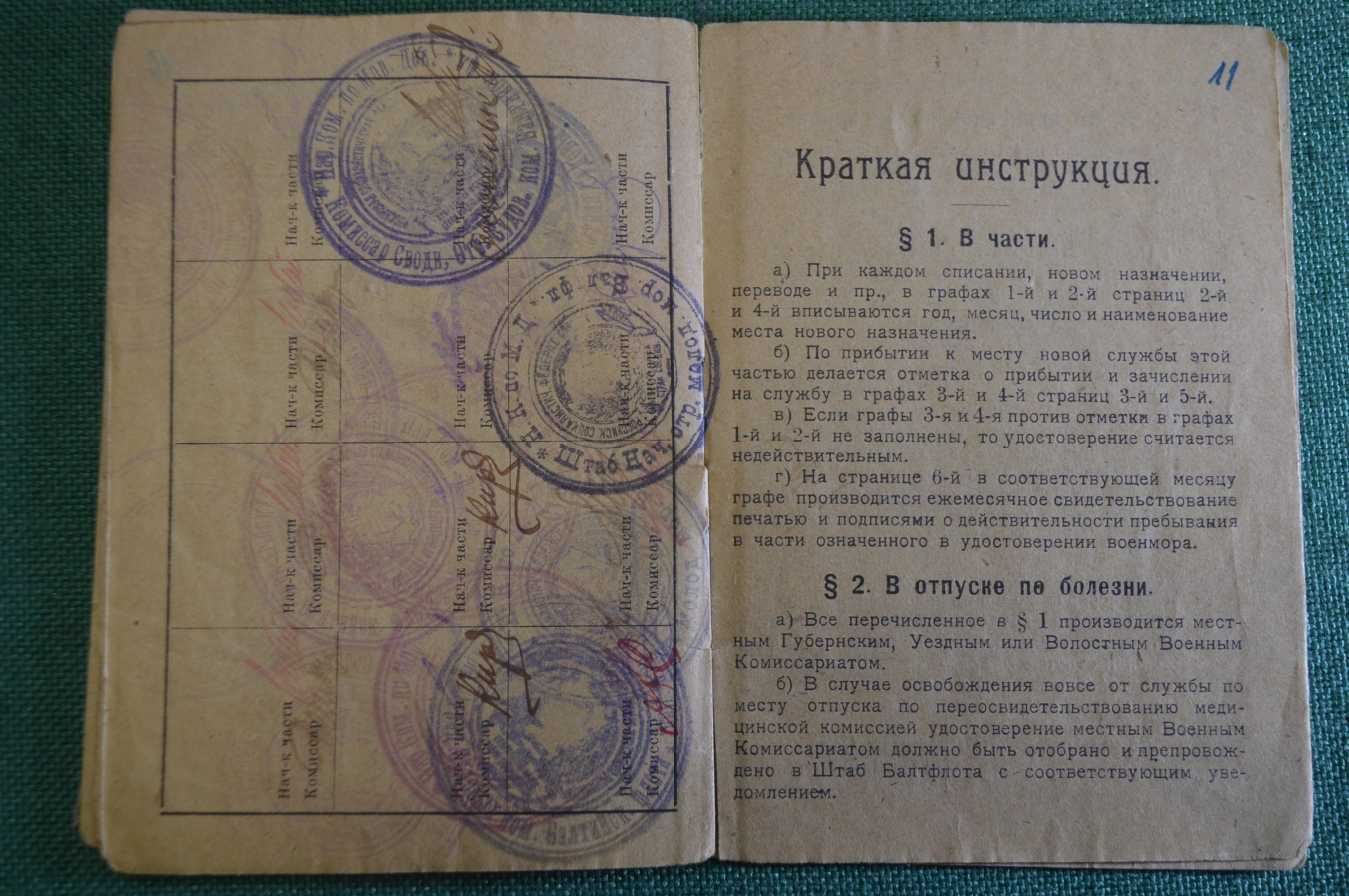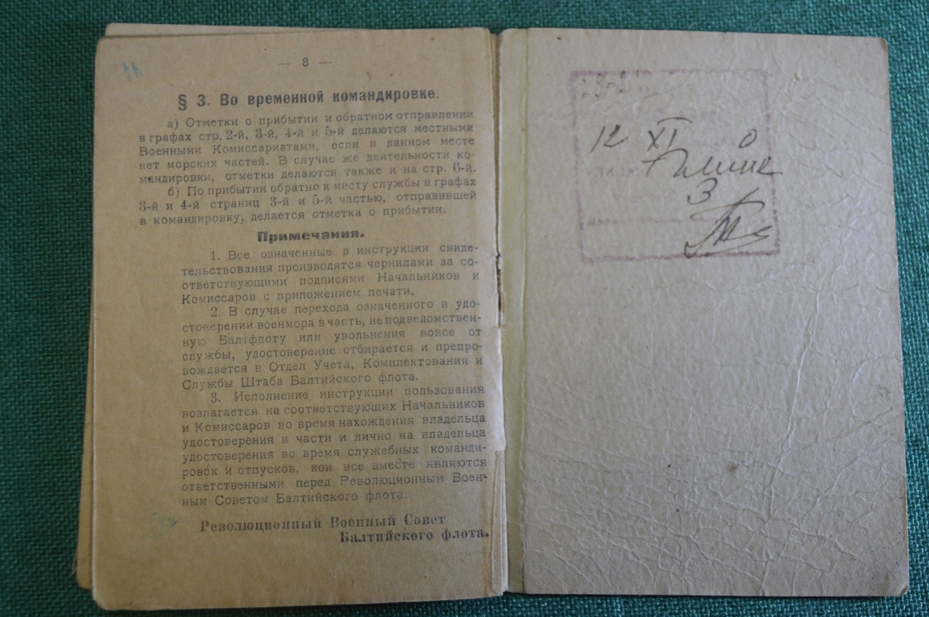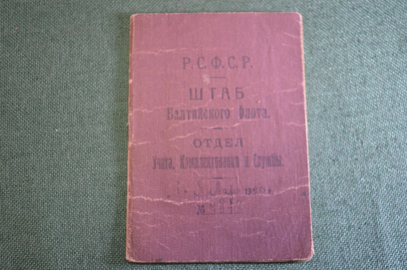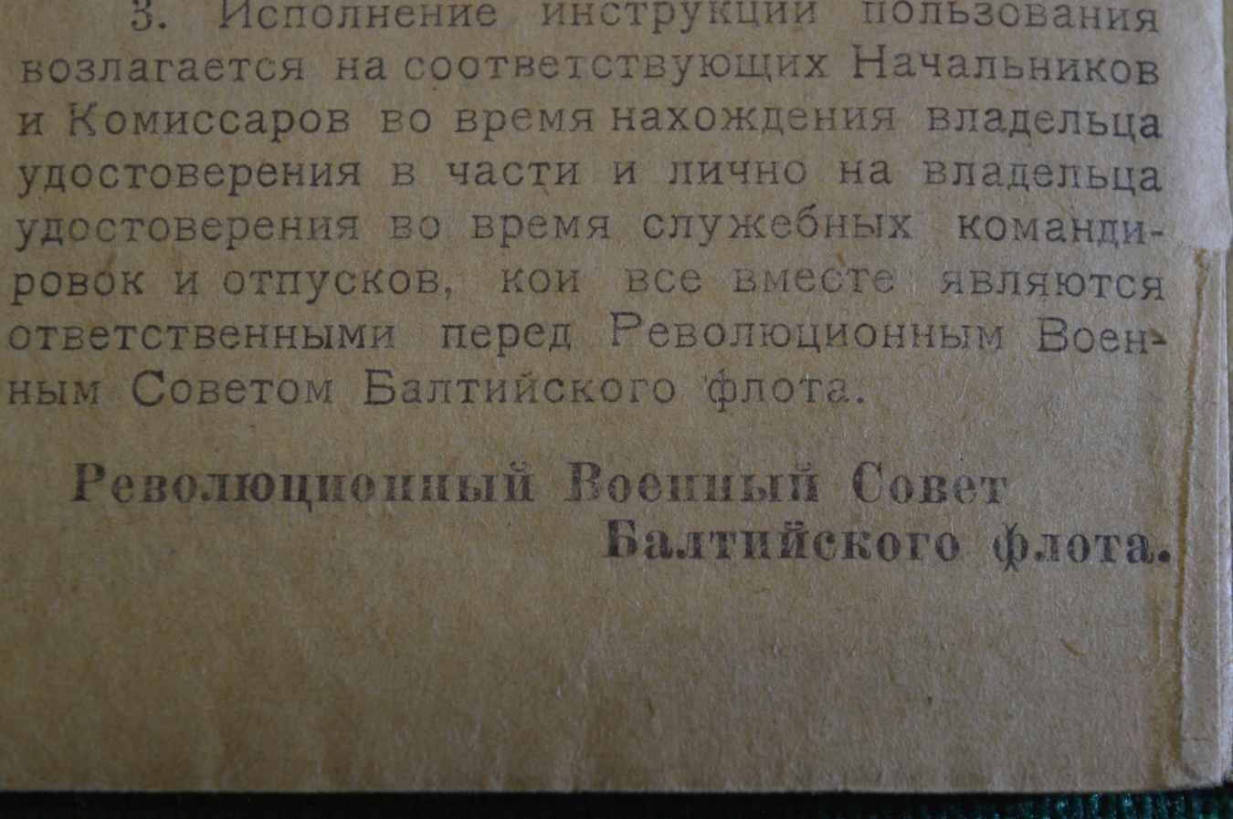 Удостоверение документ "Штаб Балтийского Флота". СССР. 1920 год.