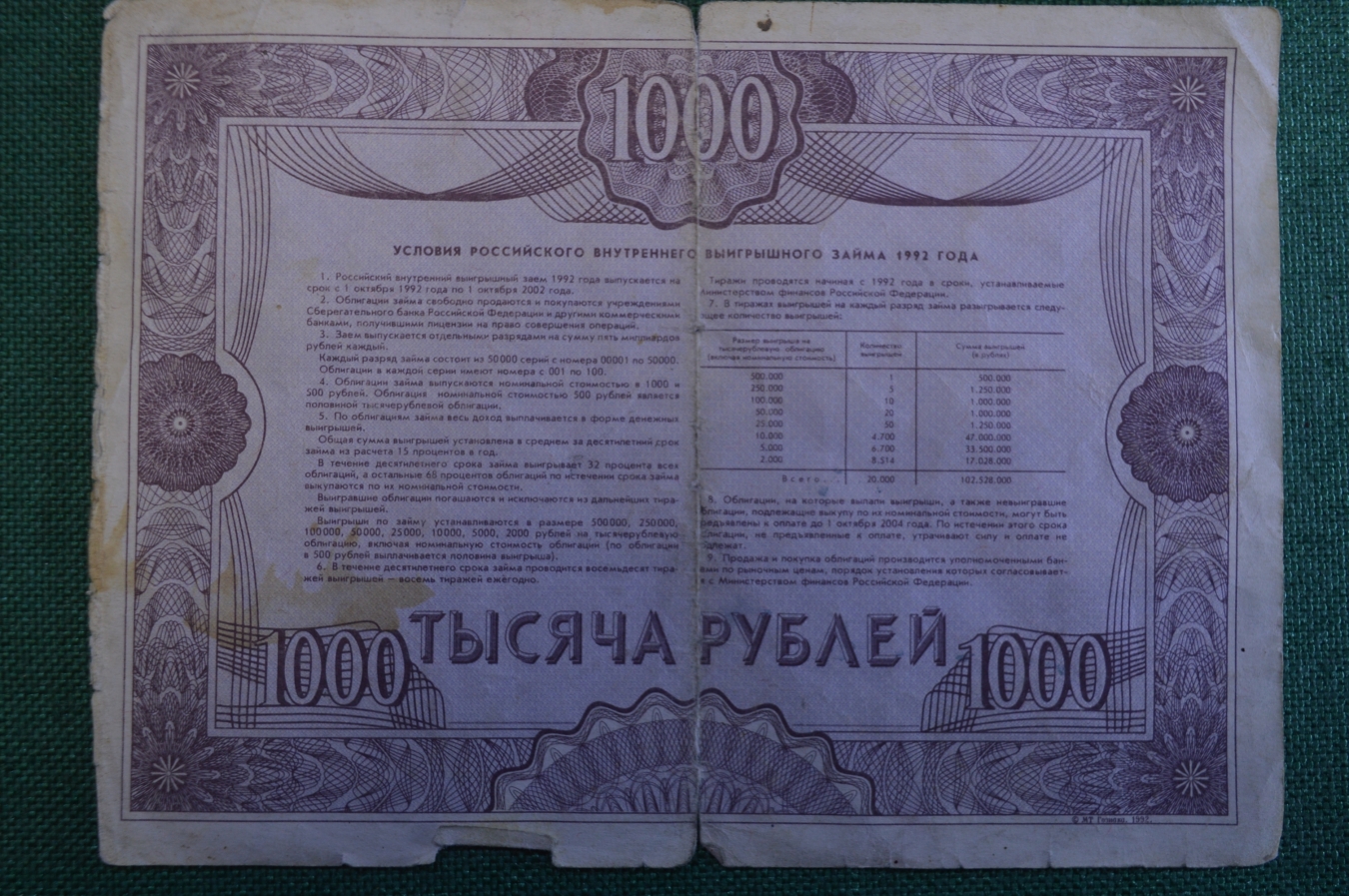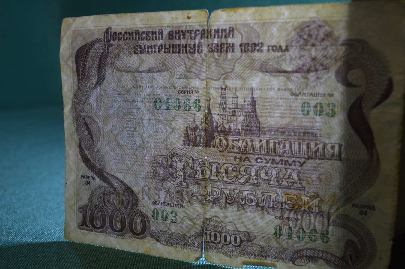 Облигация на 1000 рублей. Тысяча. Выигрышный заем 1992 года