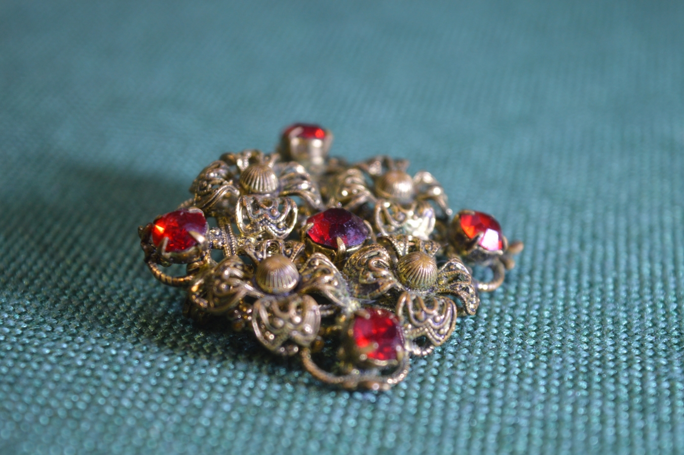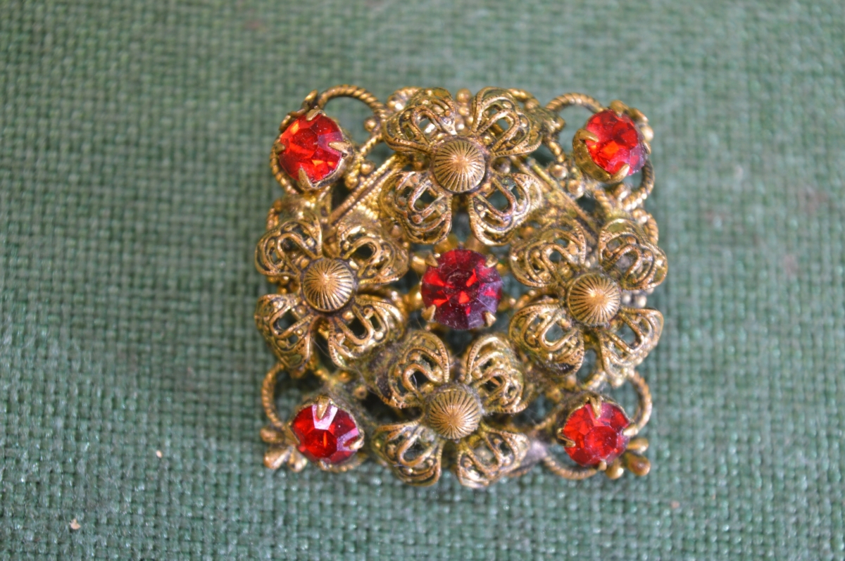 Брошь, брошка средняя, с красными камушками. Латунь.