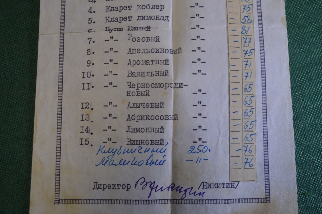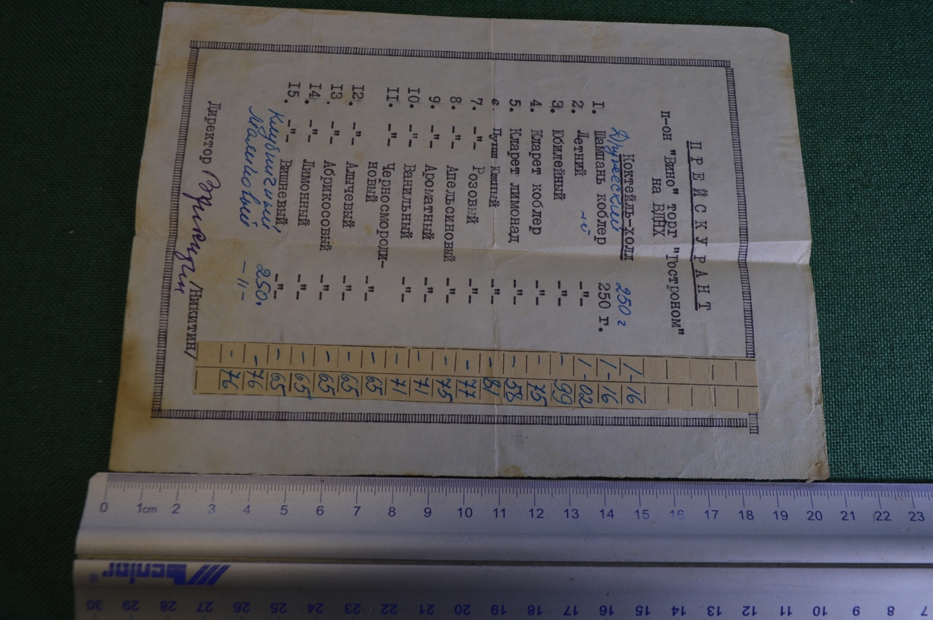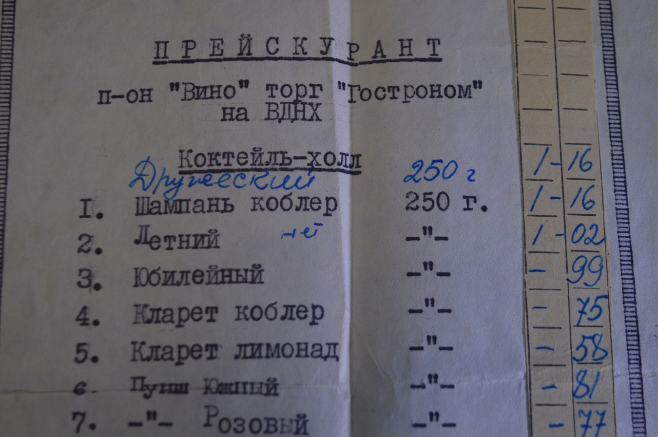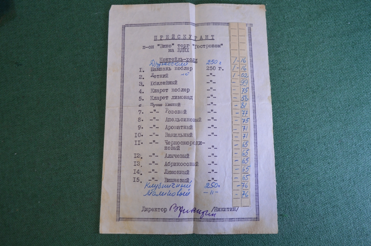 Прейскурант Павильон "Вино" Гастроном ВДНХ. Алкоголь. Коктейли. СССР. 1960е.