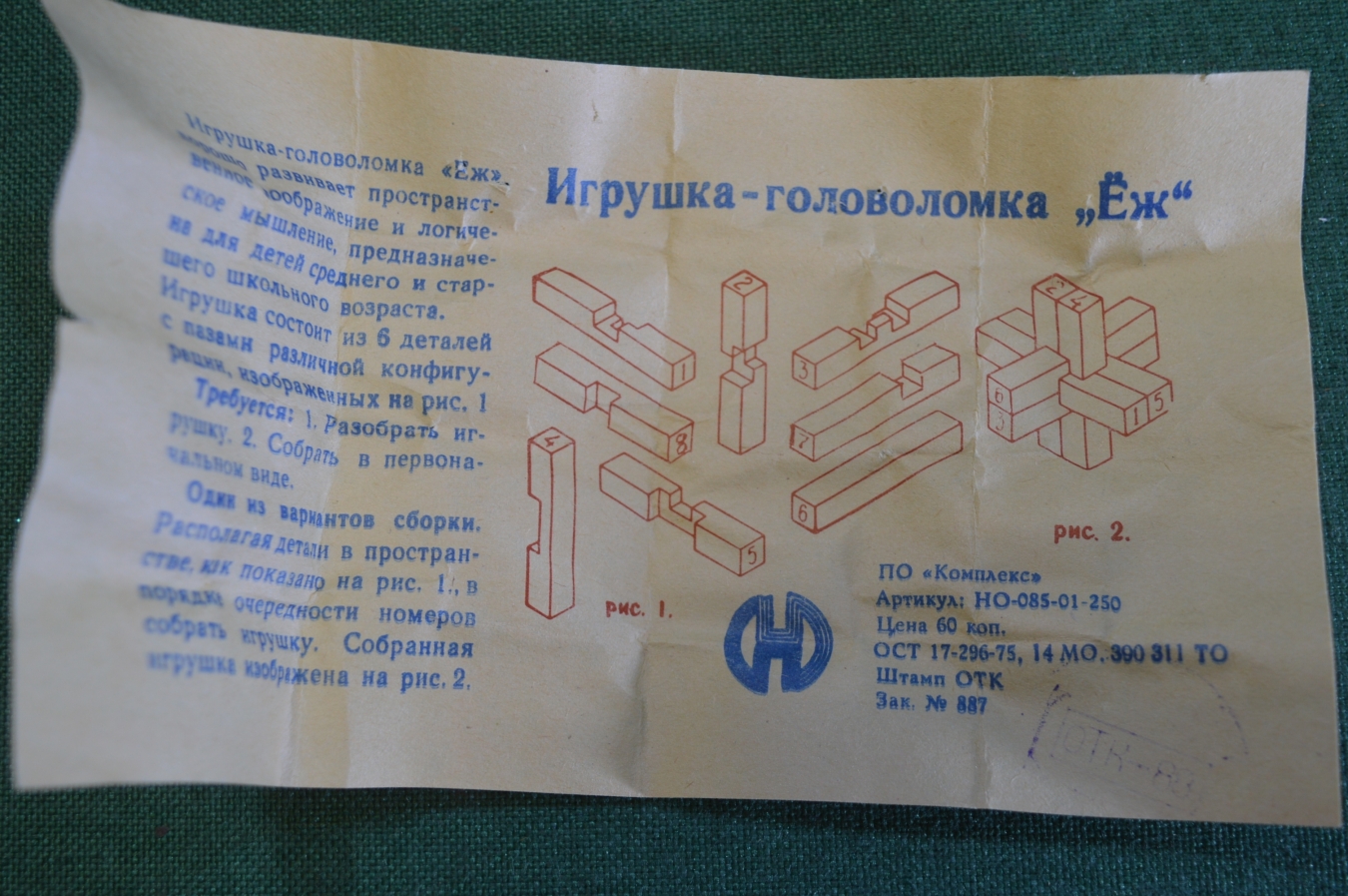 Игрушка головоломка "Ёж". Коробка, инструкция. СССР, 1988 год.