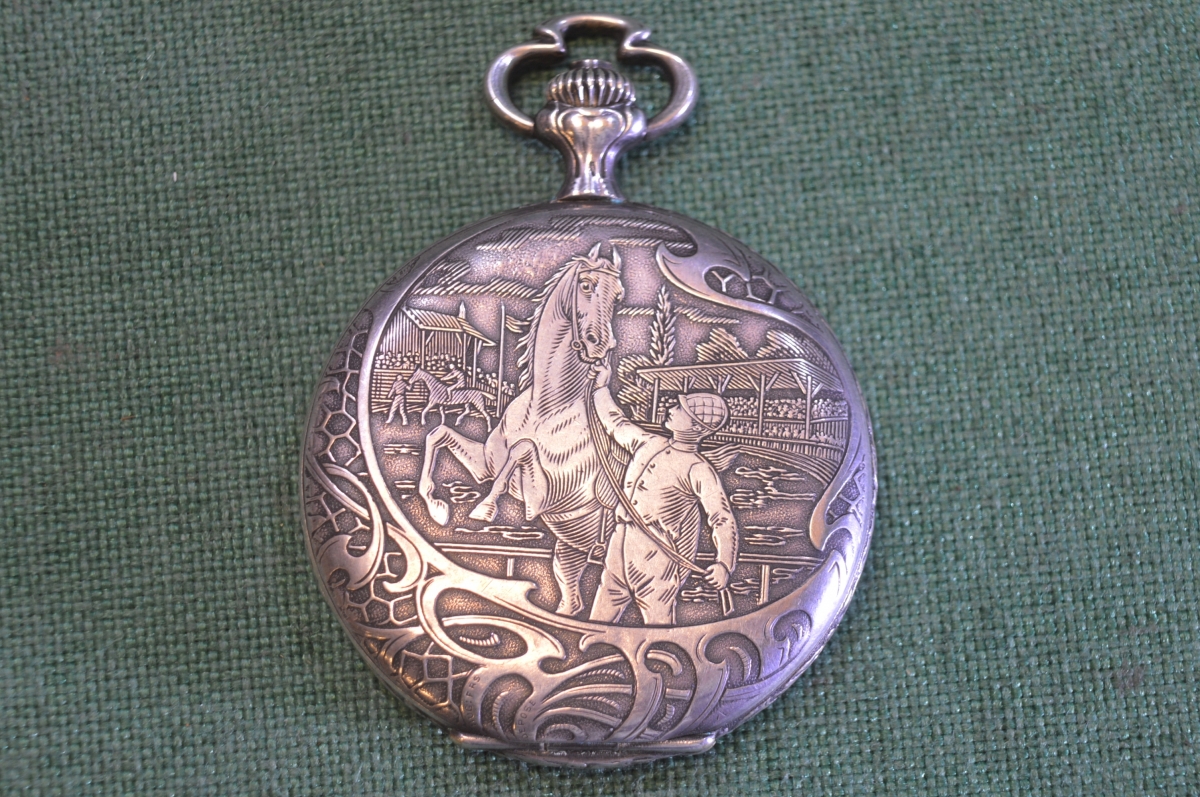 Часы старинные карманные "Скачки лошадь". Германия. Начало 20го века.