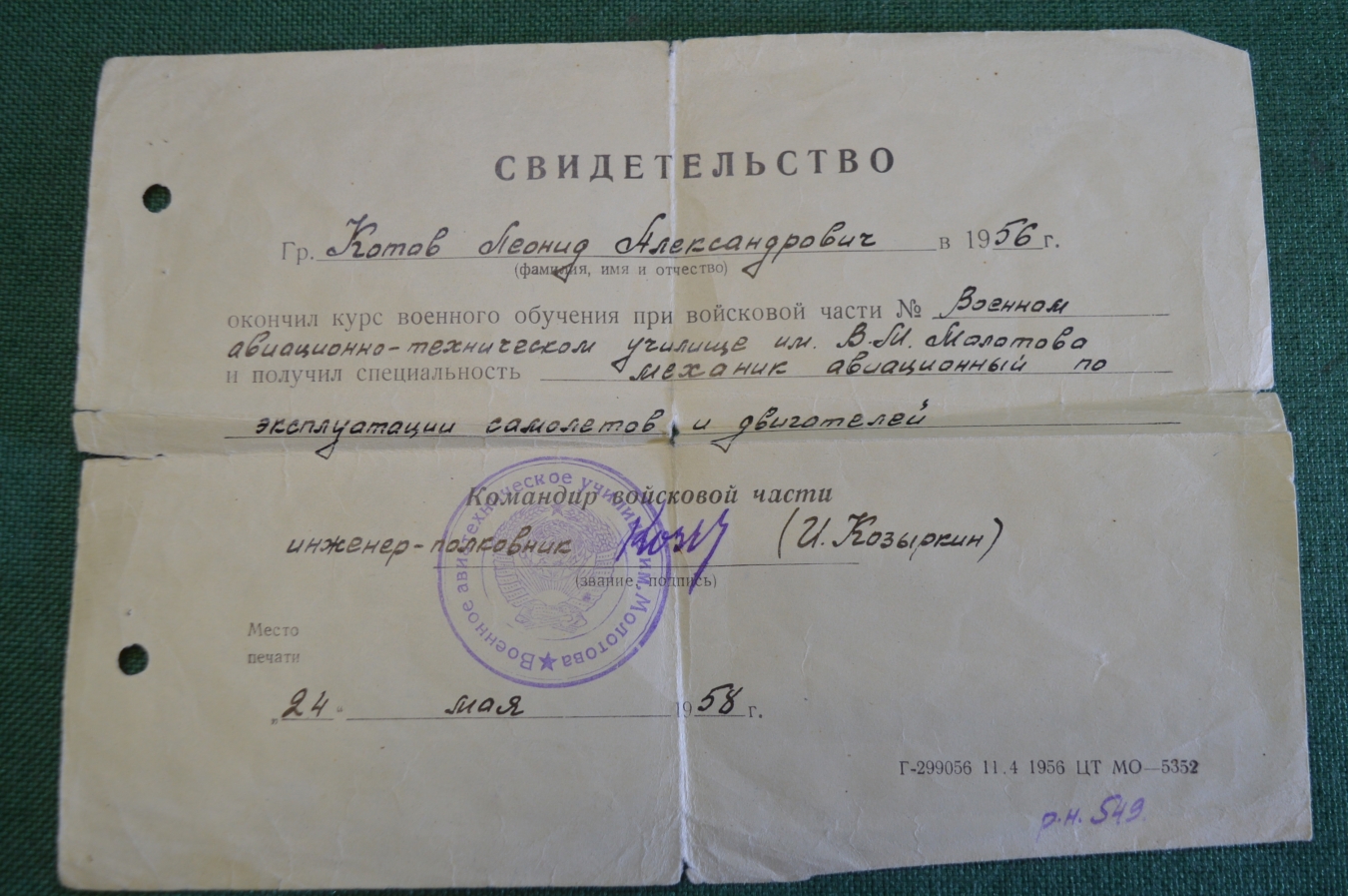 Свидетельство Военное Авиационно - Техническое училище им. Молотова. Авиация. СССР. 1958 год.