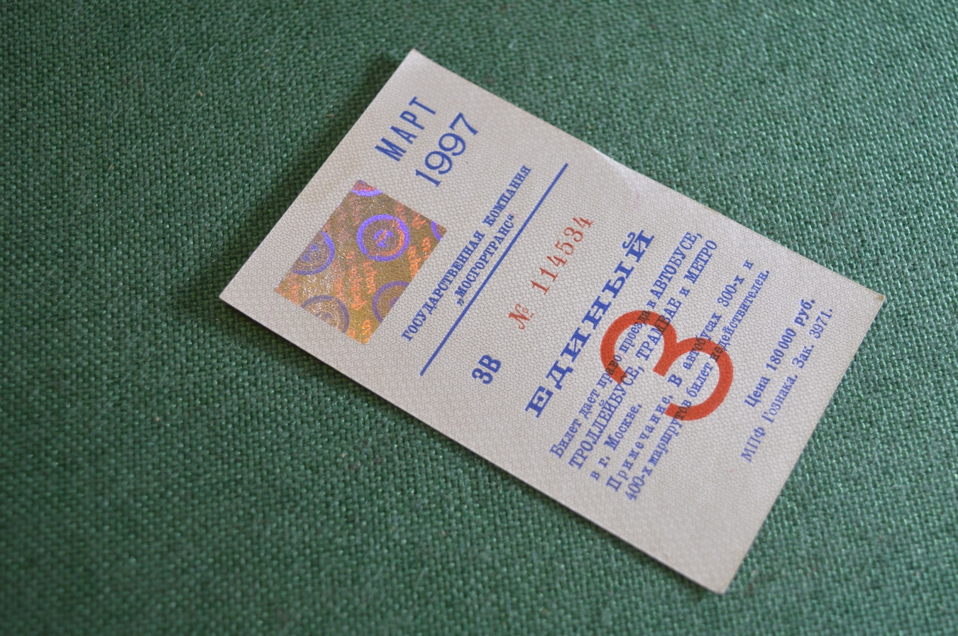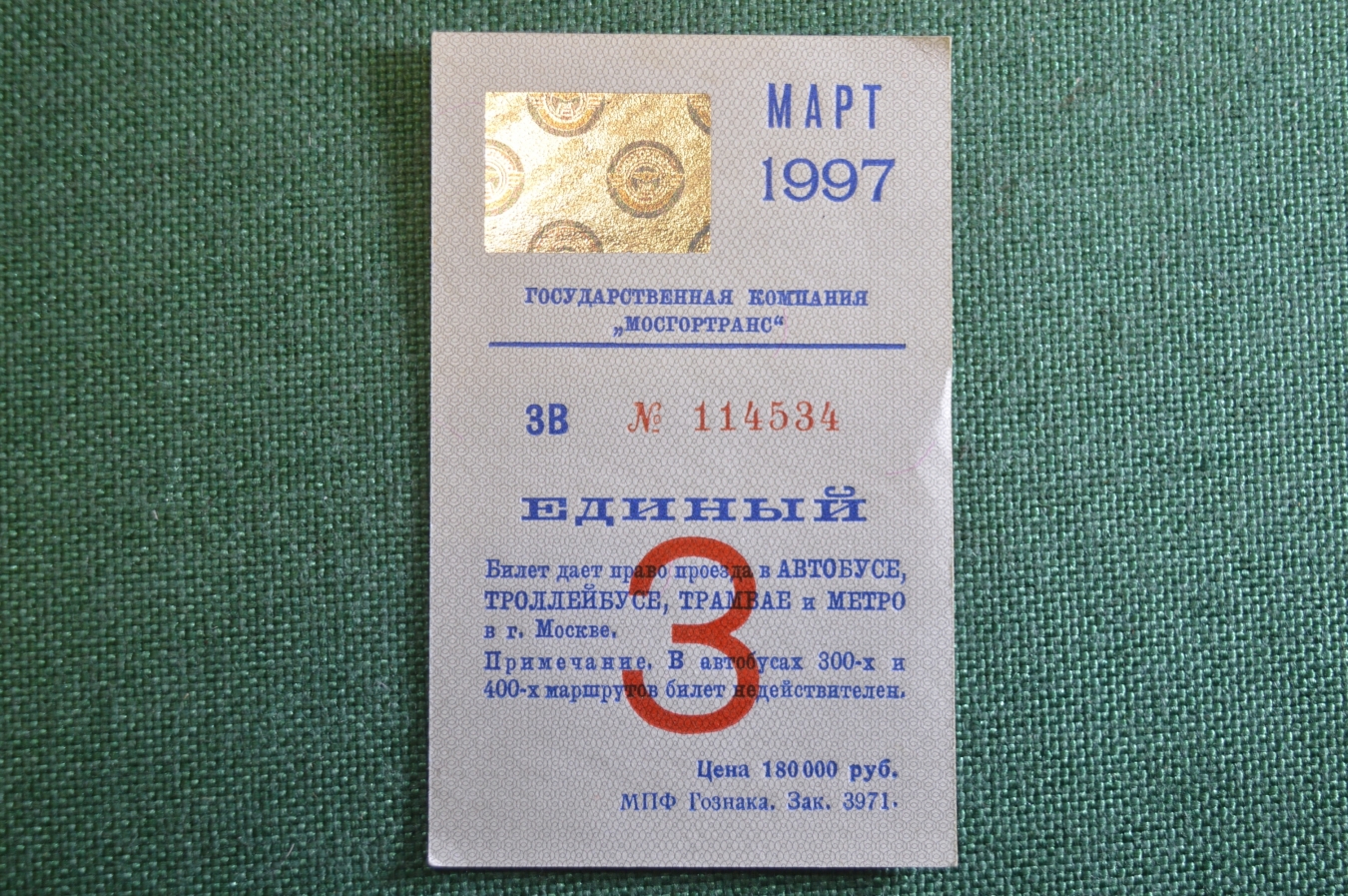 Проездной билет, Единый. Март 1997 года. Москва, Мосгортранс.