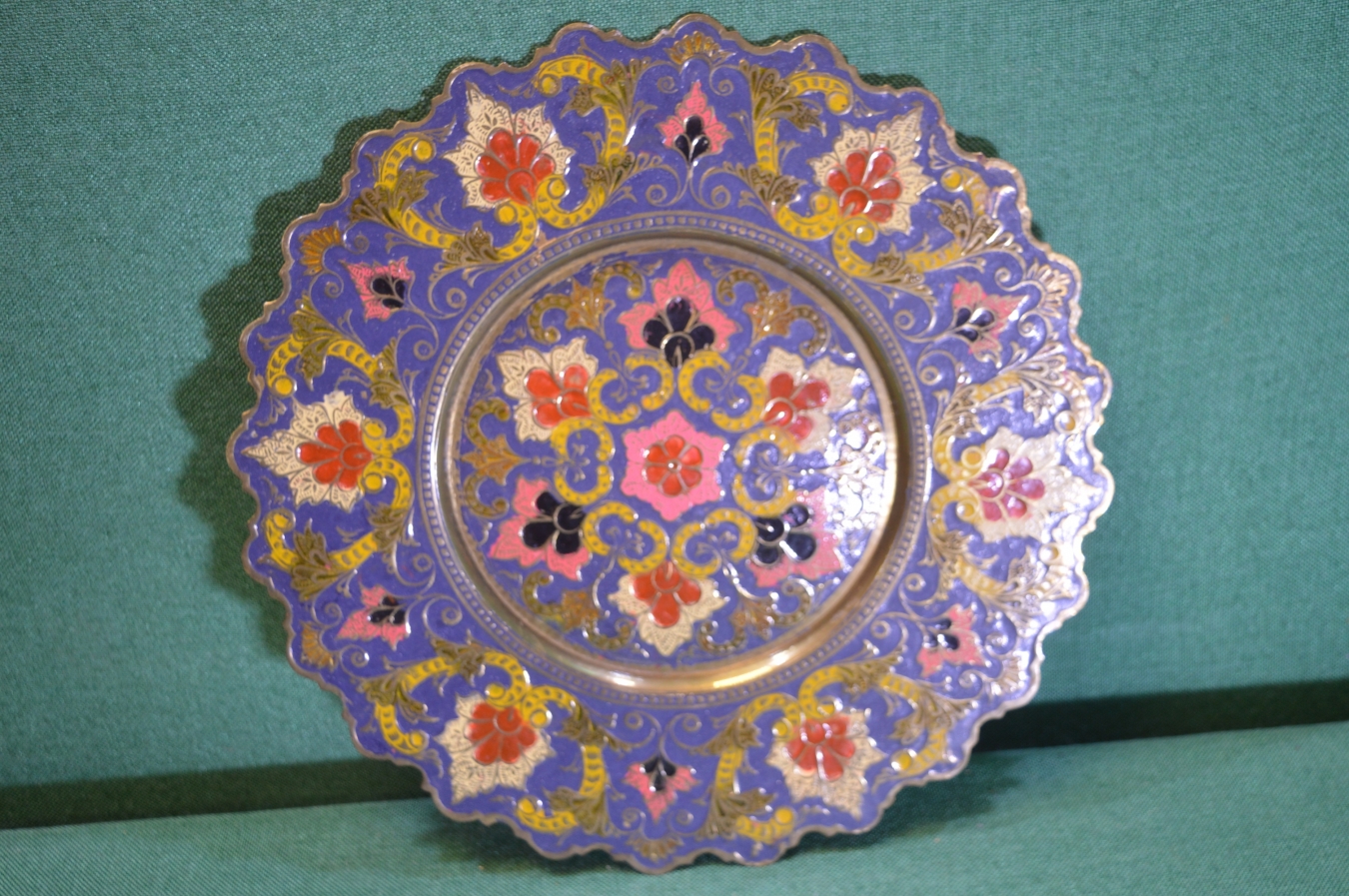 Тарелка настенная латунная. Узор. Резьба. Эмаль. Винтаж. Индия.