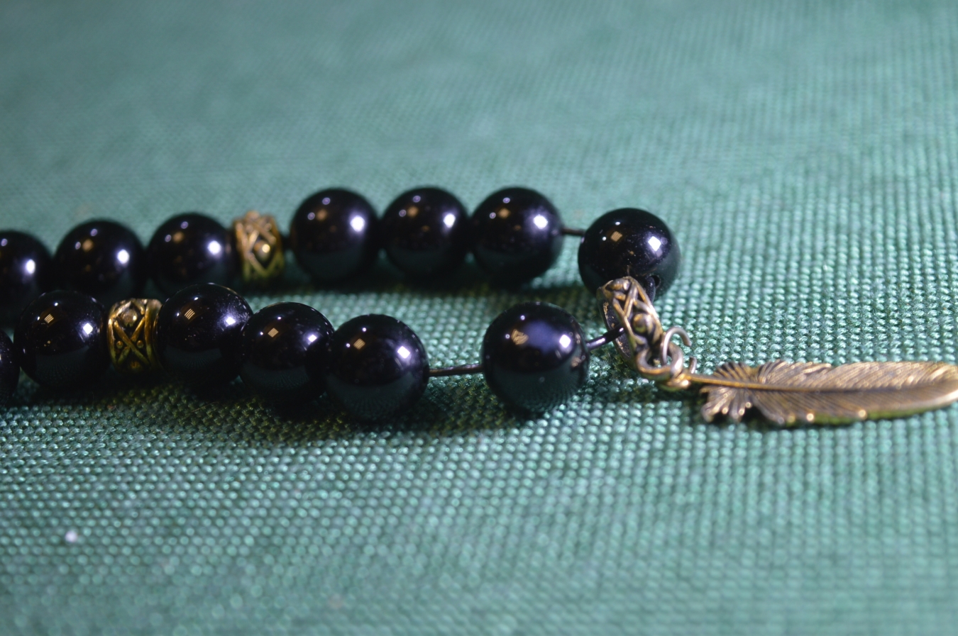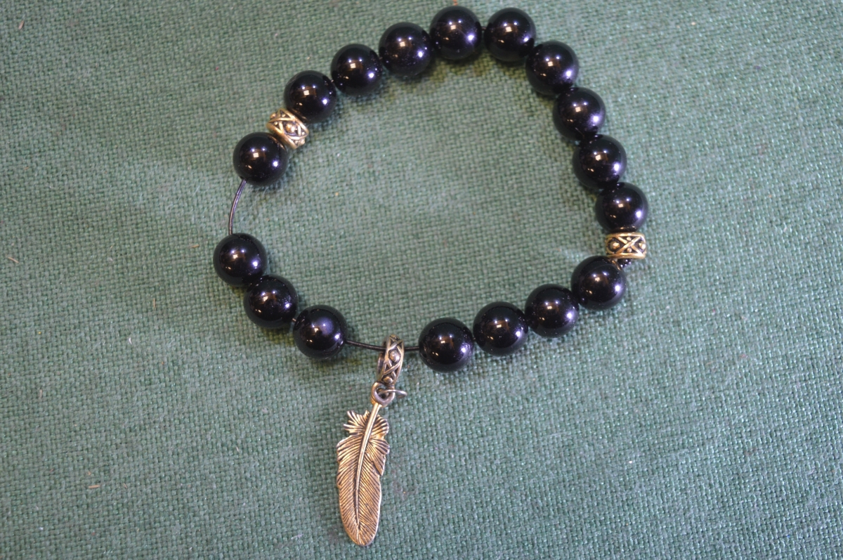 Браслет, четки с черными камнями. Камень, металл. Подвеска перо.