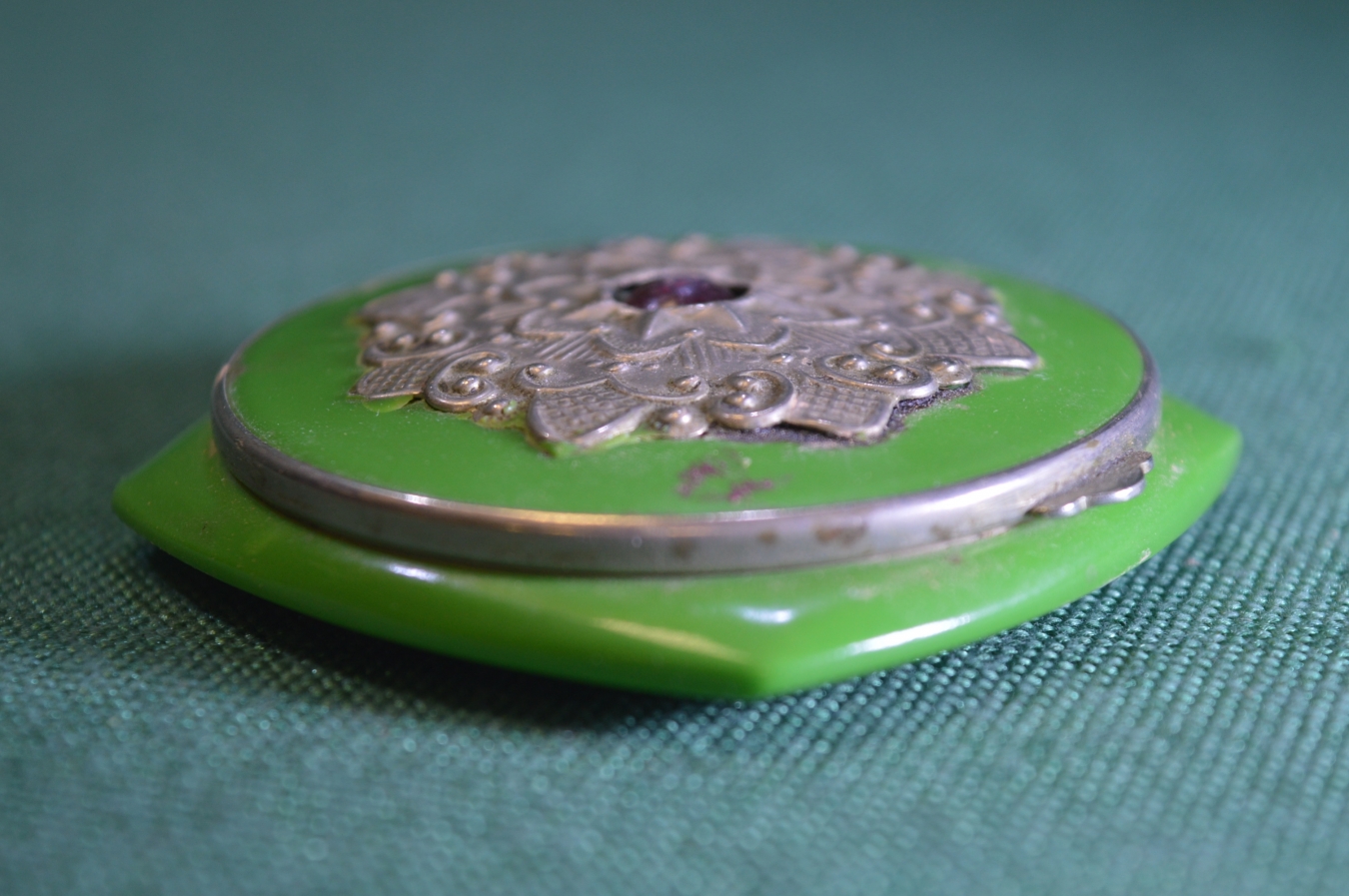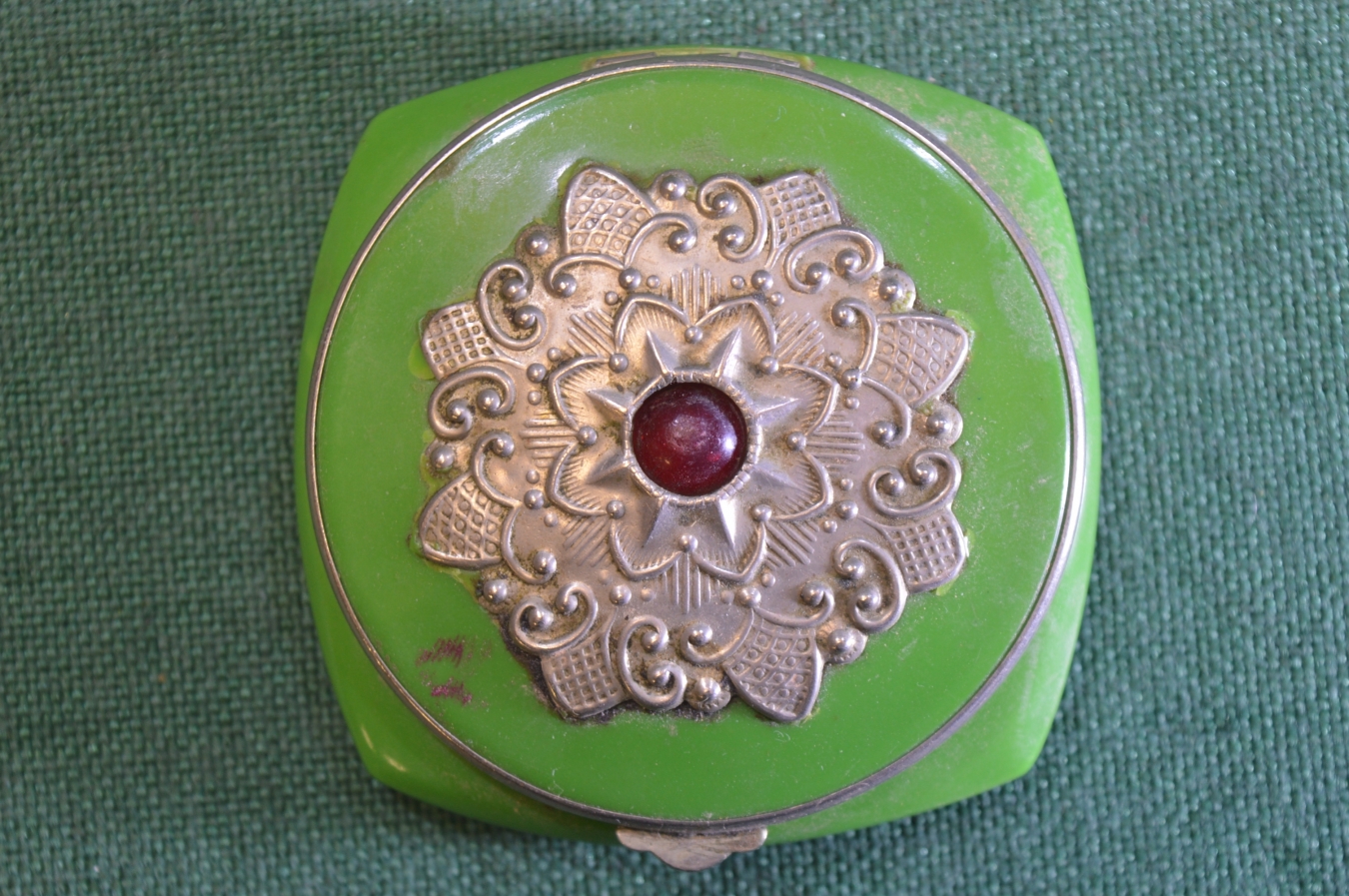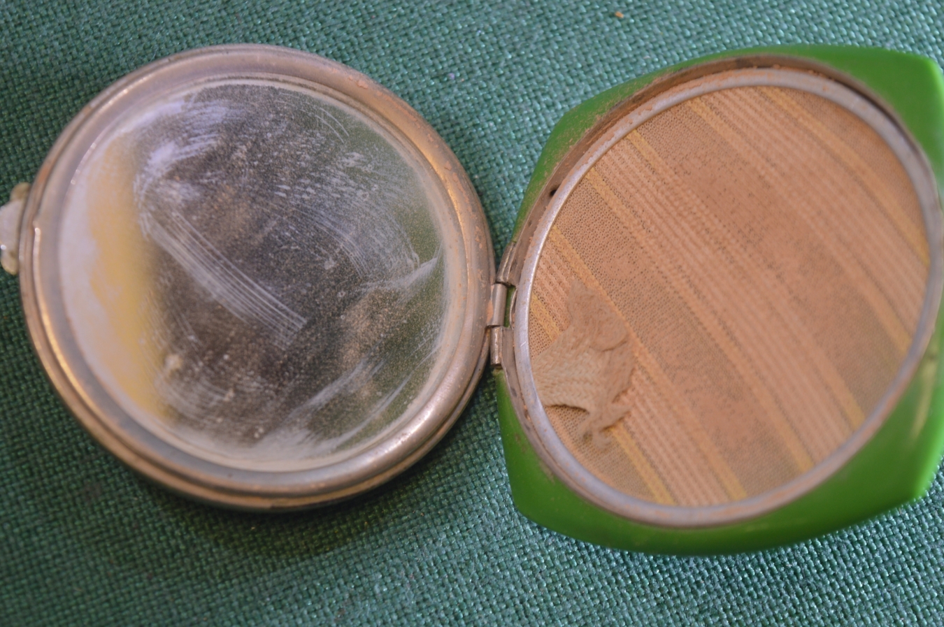 Пудреница зеленая, с зеркалом. Пластик, металл. СССР.