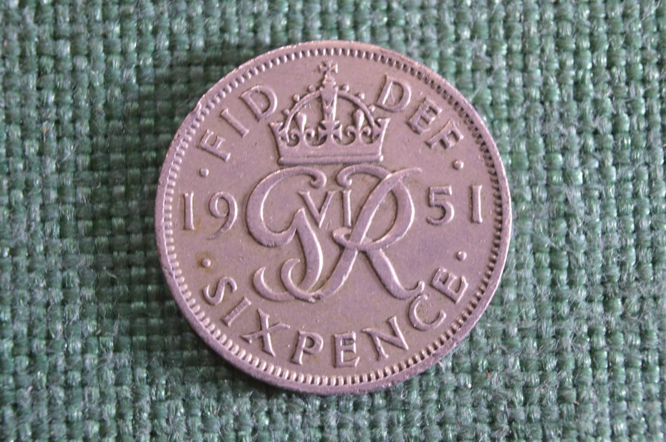 Монета 6 пенсов 1951 год. Six pence. Георг VI, Великобритания.