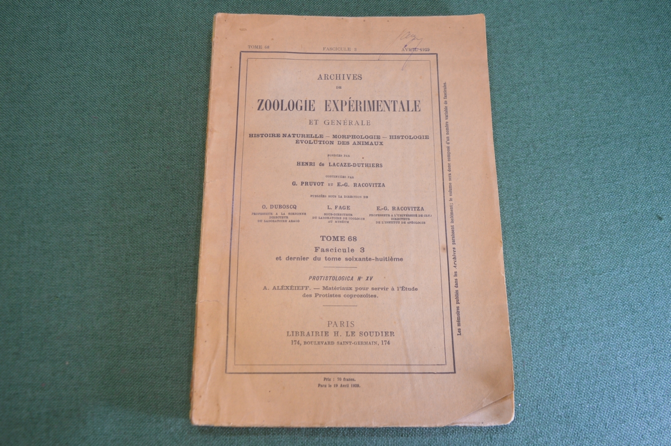 Книга старинная "Экспериментальная зоология". Протозоология. Автограф автора. Франция. 1929 год.