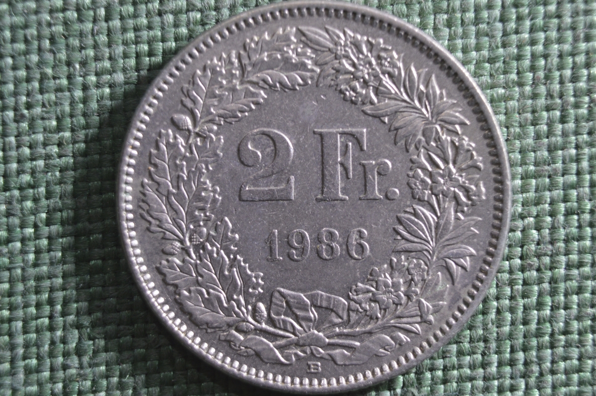 Монета 2 франка 1986 года. Буква B. Швейцария. Helvetia.