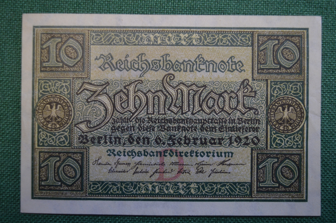 Бона, банкнота 10 марок 1920 год. Десять. Рейхсбанкнота. Zehn mark. Веймар, Германия.