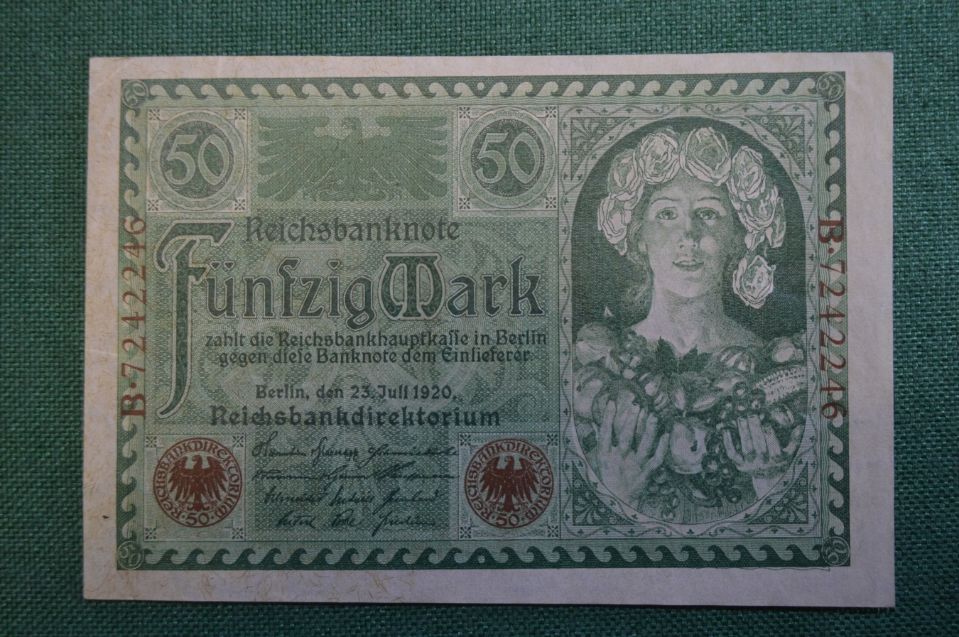 Бона, банкнота 50 марок 1920 год. Пятьдесят. Рейхсбанкнота. Веймар, Германия. #2