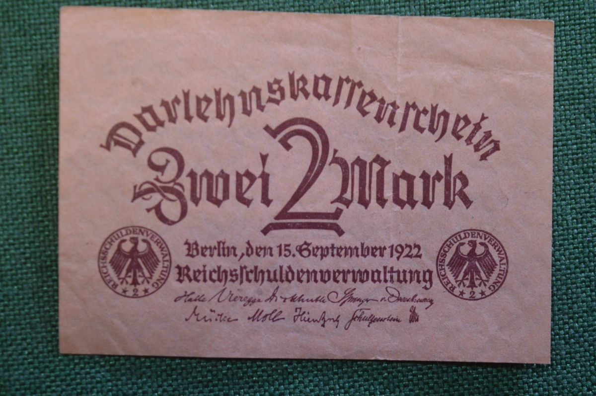 Бона, банкнота 2 марки 1922 год. Веймар, Веймарская Республика. Германия.