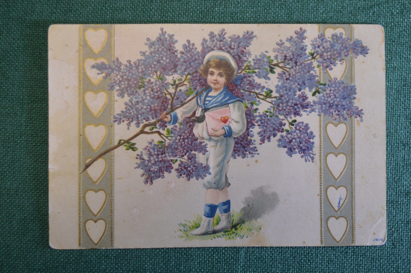 Открытка старинная "Маленький мальчик в форме матроса, сердечко, ветка сирени".